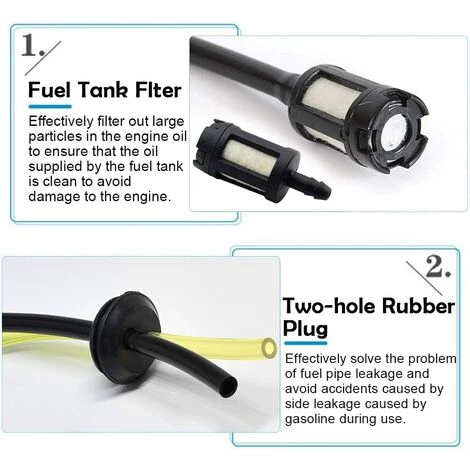 Bouchon en caoutchouc à deux trous étanche:durite essence debroussailleuse est équipé d’un bouchon en caoutchouc à 2 trous, qui peut jouer un bon rôle d’étanchéité. Cela peut non seulement résoudre efficacement le problème de fuite de la conduite de carburant, mais également empêcher l’essence et le carburant de fuir latéralement pendant l’utilisation et provoquer des accidents.